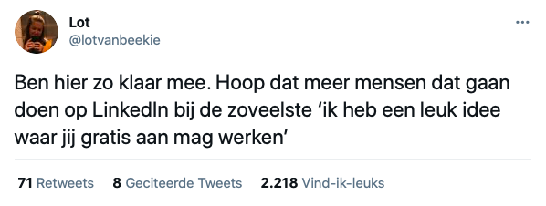 Het gebeurt regelmatig dat een stichting of bedrijf een oproep doet met de vraag of mensen op vrijwillige basis mee willen werken aan een project. Aan de ene kant kan dit zeker geen kwaad, maar anderzijds is het begrijpelijk dat sommigen die dit soort verzoeken krijgen zich afvragen waarom de één op vrijwillige basis moet werken en een ander gewoon betaald krijgt. Zo ook Lot, die zich uitspreekt over dit soort ‘gratis werk‘ verzoeken van instanties.