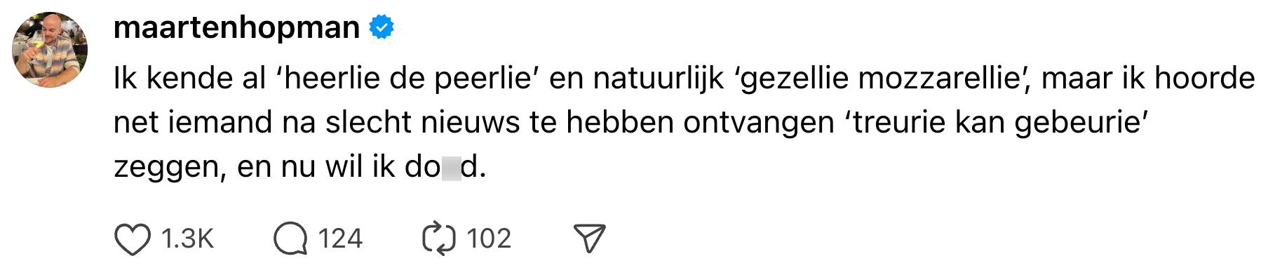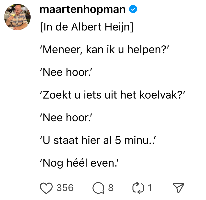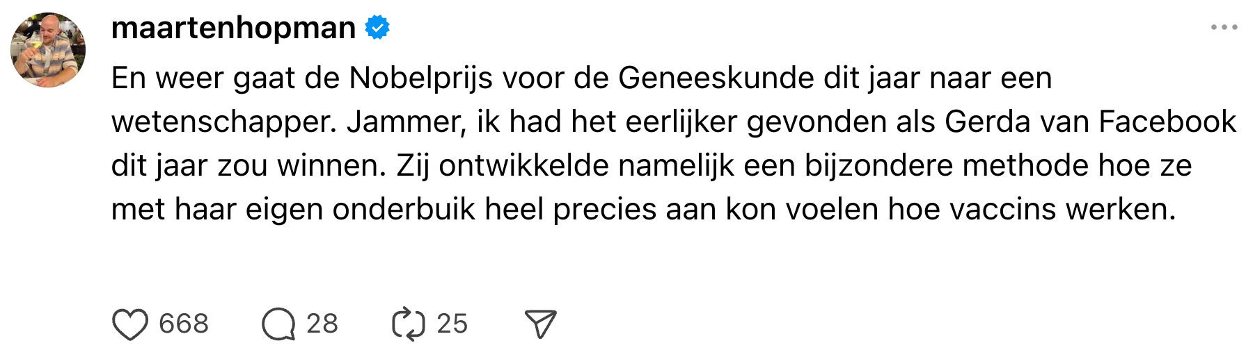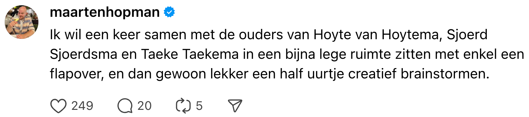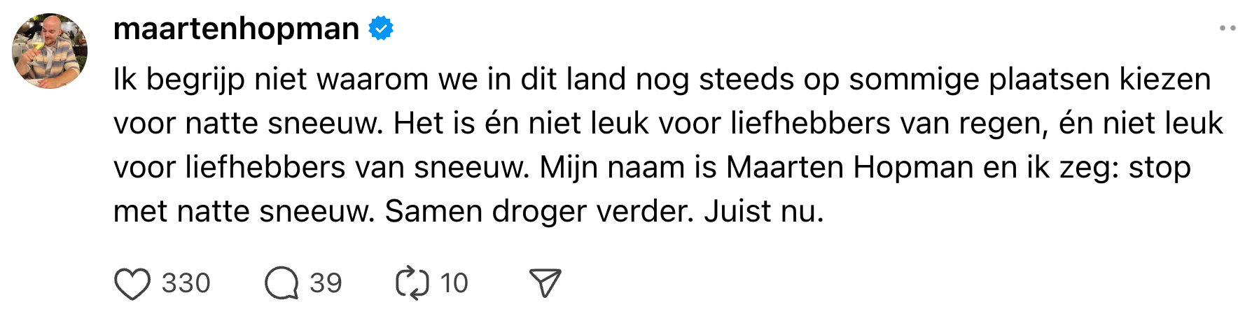 Als je meer tijd op Threads spendeert dan het stagiairtje van EasyToys, dan kan je eigenlijk bijna niet om hem heen: Maarten Hopman. Hij hopt van onderwerp naar onderwerp en bedolft het nieuws en andere actualiteiten onder een flinke dosis sarcasme. Vandaar dat hij genomineerd is voor The Best Social Awards in de categorie Beste Threader. Vraag je je nog steeds af of Maarten wel de juiste snaar raakt? Dan hebben we hier twaalf posts voor je die bewijzen dat hij zeker draadkrachtig te werk gaat.