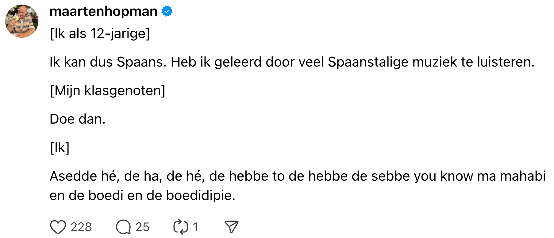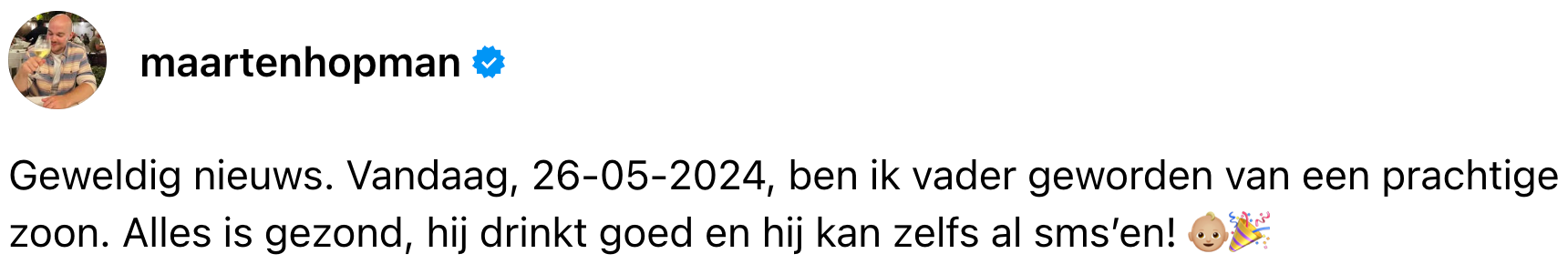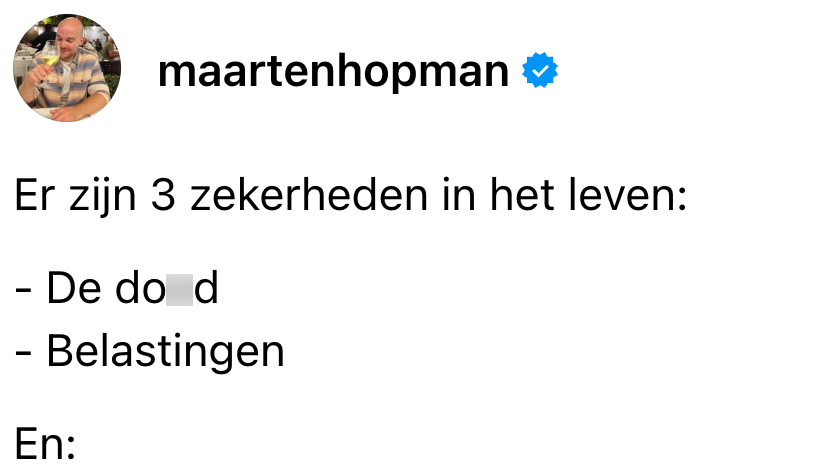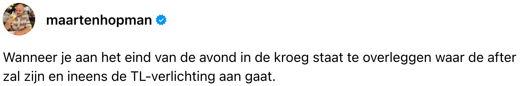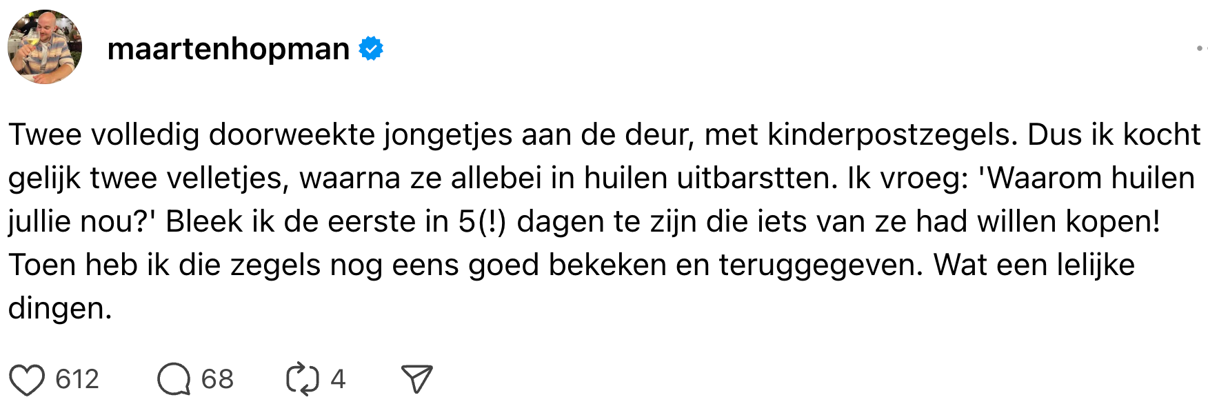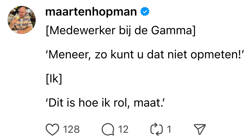 Als je meer tijd op Threads spendeert dan het stagiairtje van EasyToys, dan kan je eigenlijk bijna niet om hem heen: Maarten Hopman. Hij hopt van onderwerp naar onderwerp en bedolft het nieuws en andere actualiteiten onder een flinke dosis sarcasme. Vandaar dat hij genomineerd is voor The Best Social Awards in de categorie Beste Threader. Vraag je je nog steeds af of Maarten wel de juiste snaar raakt? Dan hebben we hier twaalf posts voor je die bewijzen dat hij zeker draadkrachtig te werk gaat.