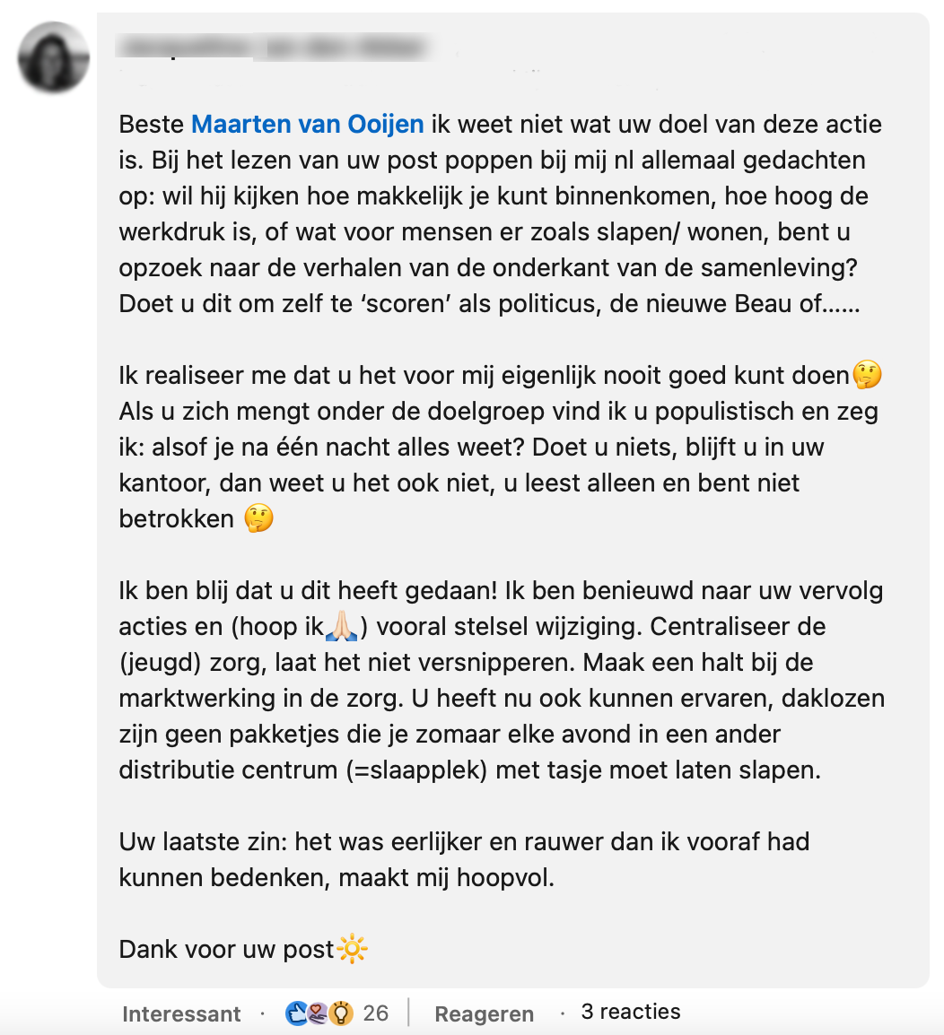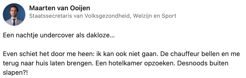 Staatssecretaris van Volksgezondheid, Welzijn en Sport Maarten van Ooijen deelt op zijn LinkedIn een anekdote van een werkbezoek. Dit is niet het werkbezoek waar je automatisch aan denkt als je een politicus voor je ziet. Maarten van Ooijen ging namelijk een nacht undercover als dakloze in Den Bosch. Hij krijgt zowel positief als negatief commentaar op dit bijzondere ‘werkuitje’.