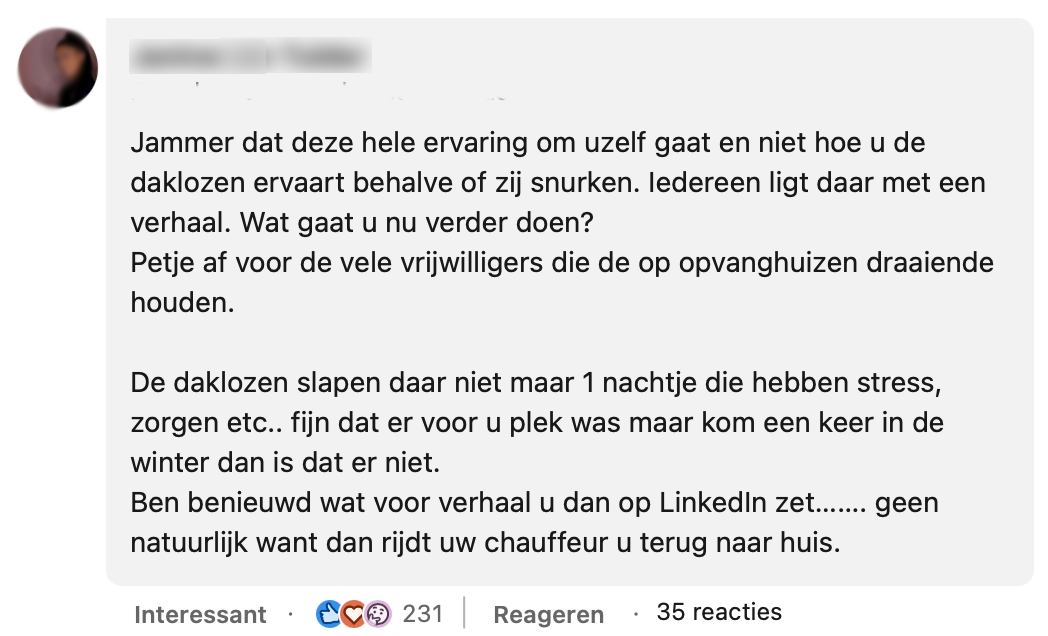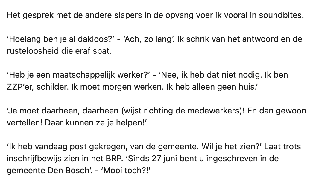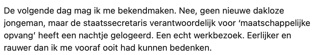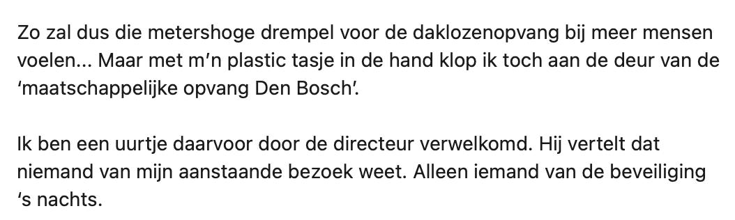 2. Hij beseft zich dat het voor daklozen waarschijnlijk ook een hoge drempel is om ergens aan te kloppen.