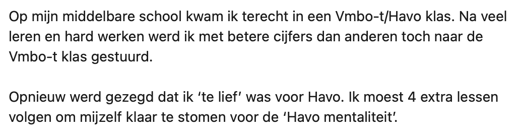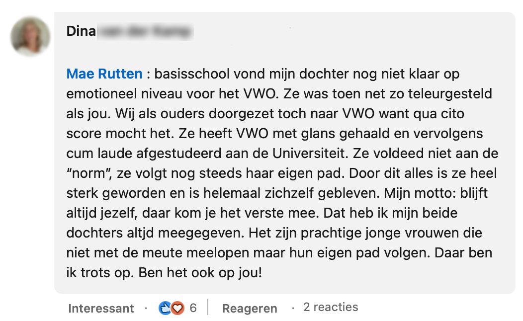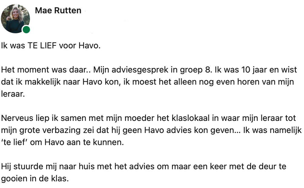 1. Doordat de leerkracht van Mae haar te lief vond, kreeg ze niet het schooladvies waar ze op hoopte.