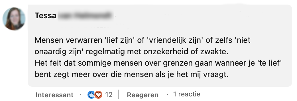 8. Tessa maakt nog even duidelijk dat lief zijn niets te maken heeft met onzekerheid.