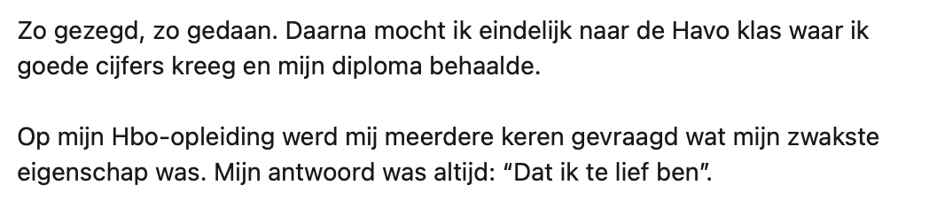 Soms zegt iemand iets tegen je en draag je dat de rest van je leven met je mee. Zonder dat diegene er erg in had, is er een gevoelige snaar geraakt. Mae had dit ook toen haar groep 8-docent zei dat ze TE lief was. Deze opmerking is haar altijd bijgebleven, maar gelukkig kwam daar laatst verandering in.