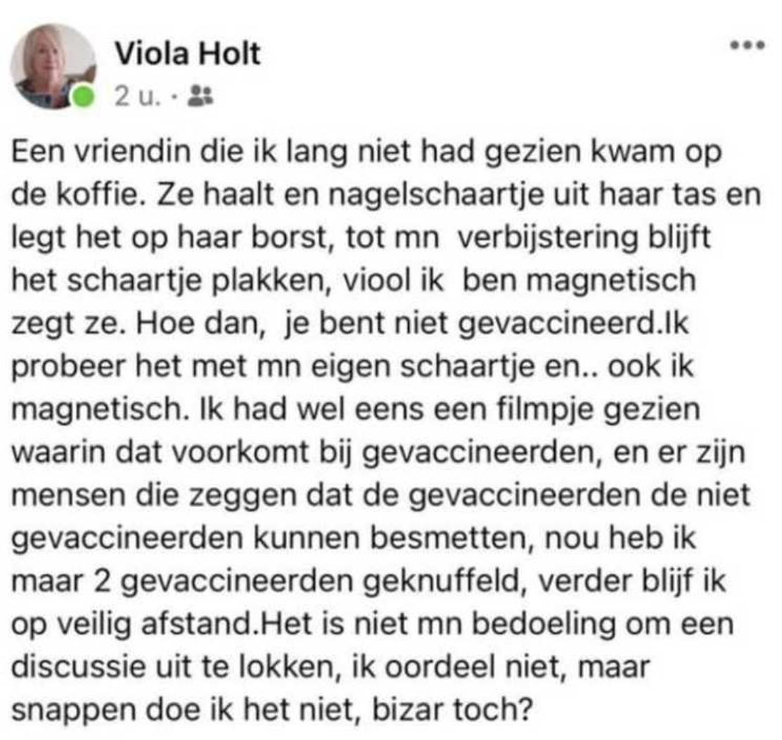 Het coronavaccin: er is veel over gezegd. Er zijn voor- en tegenstanders. Een van die tegenstanders is vaderslands presentatrice Viola Holt. Ze post een bericht op Facebook na een ontmoeting met ‘een gevaccineerde’, waar ze een wel heel bijzondere bijwerking aan heeft overgehouden. Op social media trekt het bericht, in plaats van metaal, bijzonder veel humor aan.