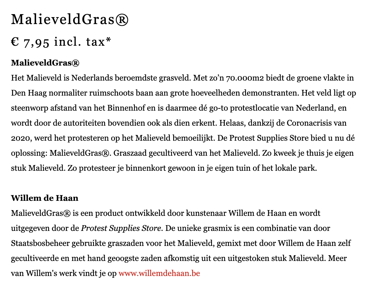 Het Malieveld is dé plek in Nederland om te protesteren. Maar wat nou als je de politieke impact die het Malieveld toevoegt aan een protest, naar je eigen achtertuin kan halen? Dat wilde kunstenaar Willem bereiken. Hij ontwikkelde het product ‘Malieveldgras’, waarmee hij andere vormen van (lokaal) protest door heel Nederland wil stimuleren.