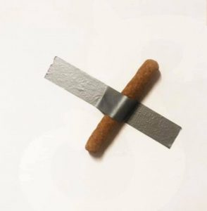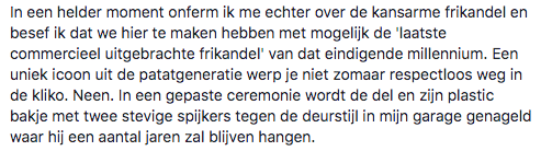 2. Hij had een zware feestavond voor de boeg en wat doe je dan? Juist ja: een flinke bodem leggen met dat wat de lokale snackbar te bieden heeft. De ogen bleken groter dan de maag en dus bleven er wat dingetjes over. Waaronder: een toen nog verpakte frikandel.