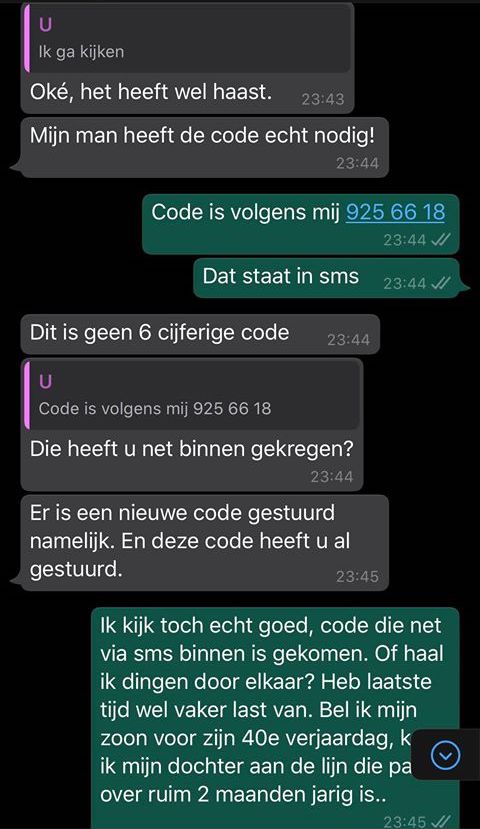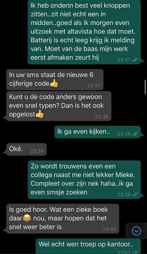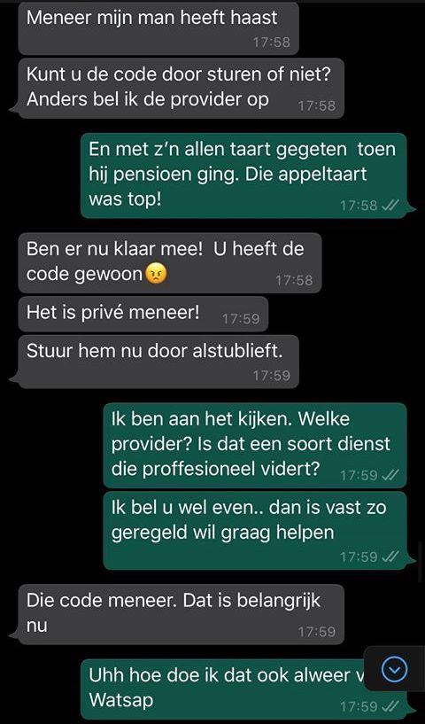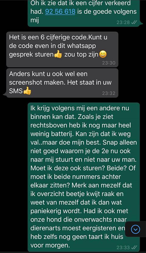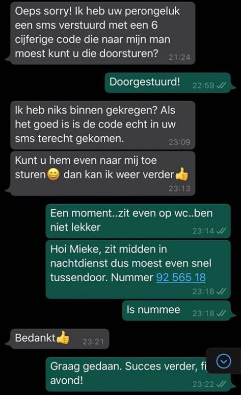 1. Goed, het gaat dus een keer niet om een telefoonrekening van een paar meiers die nog betaald moet worden, maar om een zes cijferige code. En de oplichter die deze code wil, heet deze keer Mieke.