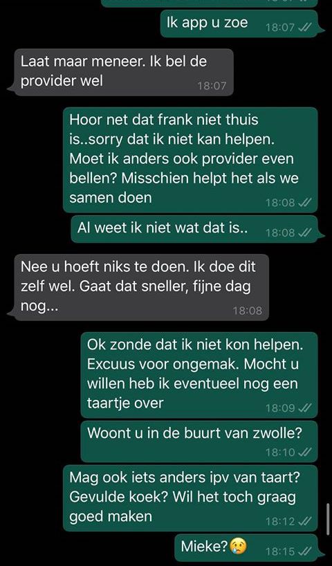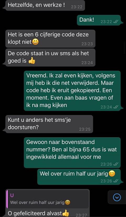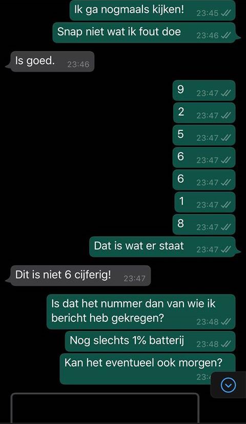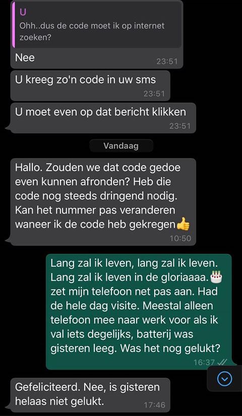 16. Nou, einde verhaal zou je denken. Maar nee hoor. Later die krijgt Rik een appje van een ander nummer, maar met dezelfde intenties. Het bijzondere is dat de twee oplichters (of misschien is het dezelfde met twee nummers, weten wij veel) elkaar kennen, want Rik wordt meteen gefeliciteerd met zijn zogenaamde verjaardag.