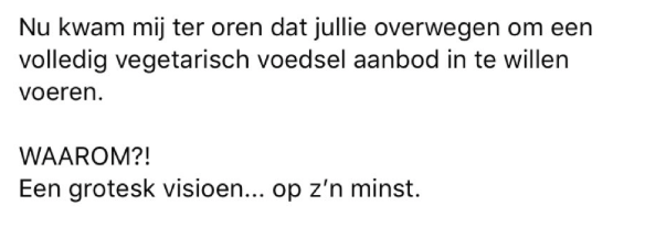 Daarom moet je het nooit aankondigen dat je als bedrijf/evenement 100% vegetarisch wordt maar het gewoon doen. Gegarandeerd dat niemand het doorheeft