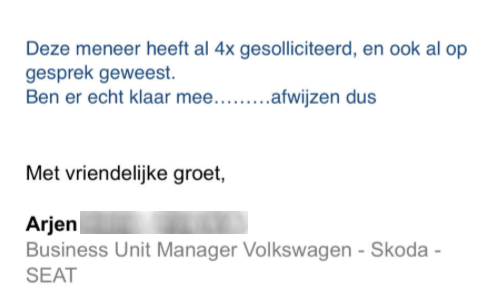 Het is nooit leuk om afgewezen te worden voor een functie bij een bedrijf waar je graag wilt werken. Helaas overkwam dat Nawfal een tijdje terug. Hij solliciteerde niet één, niet twee, maar wel vier keer – om vervolgens een bijzonder botte afwijzingsmail te ontvangen… die niet eens voor hem bedoeld is. Nawfal deelt zijn ervaring op LinkedIn en Facebook, om mensen eraan te herinneren dat je anderen altijd met respect moet behandelen (én dat het geen kwaad kan om even te dubbelchecken naar wie je een mail stuurt).