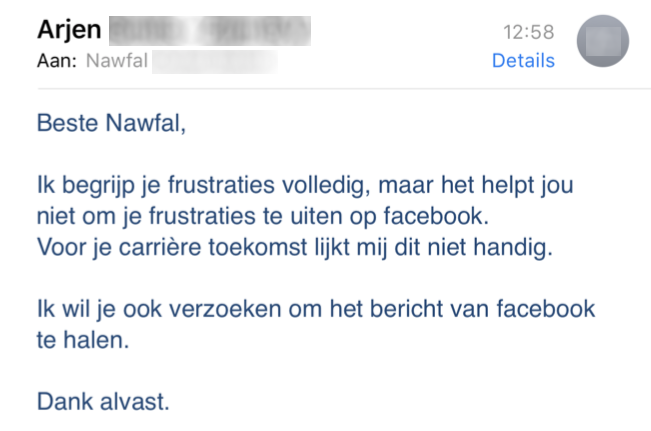 6. Dan krijgt Nawfal een nieuw mailtje, nadat hij vroeg om een verklaring.