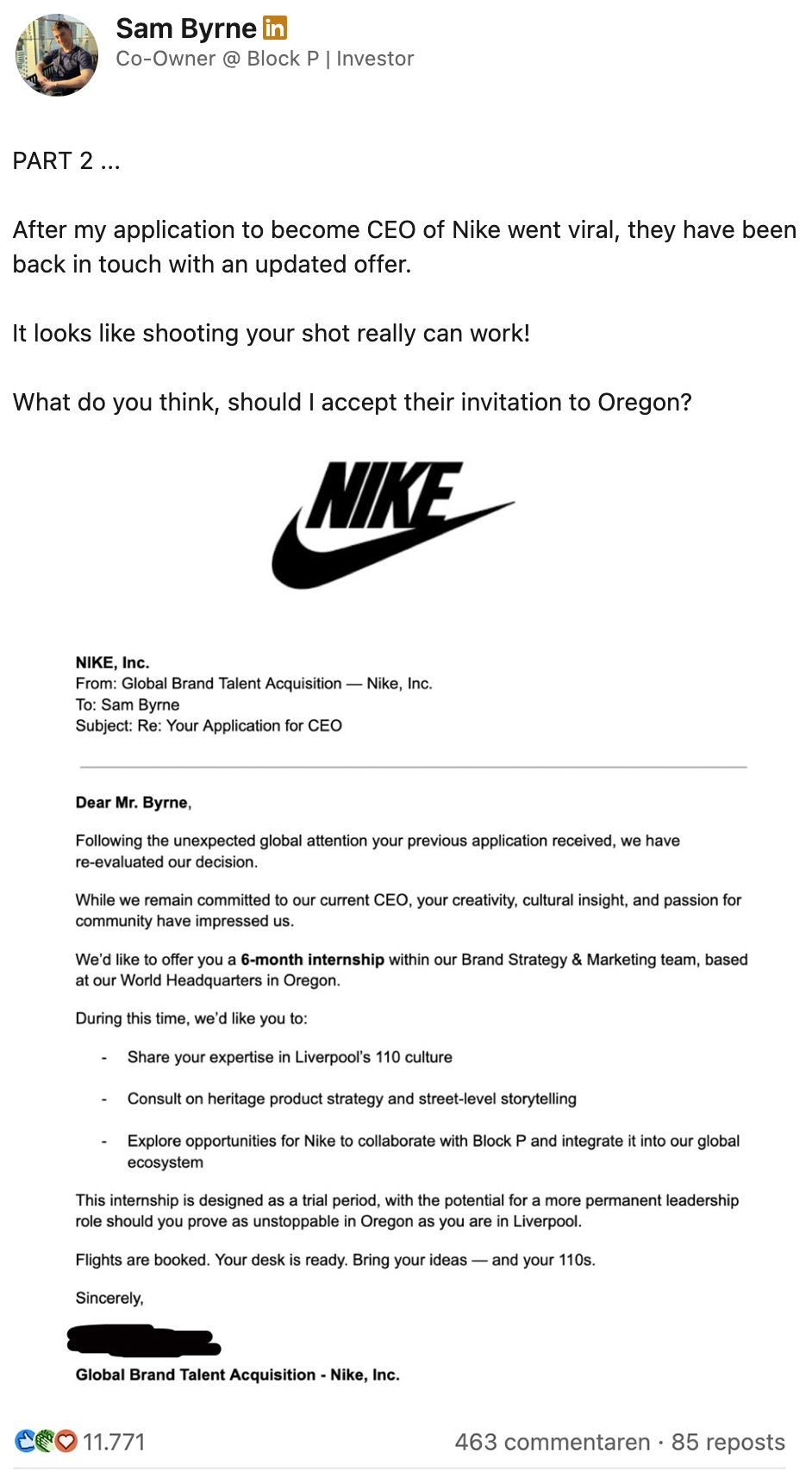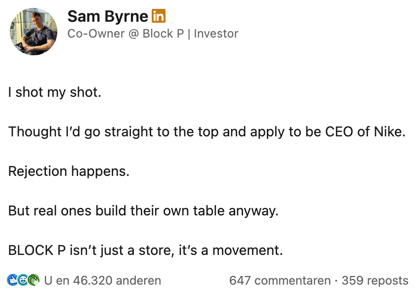 Nee heb je, ja kun je krijgen. Zo werkt het eigenlijk met alles in het leven. Of je nou vraagt of je even in de cockpit van een vliegtuig mag gluren, een extra klodder mayo probeert te scoren bij de frietboer of bij je baas om een vrije dag smeekt: soms moet je het gewoon proberen. Ook Sam waagt het erop: hij solliciteert naar de functie van CEO bij Nike. Het resultaat? Een stortvloed aan reacties op LinkedIn én (verrassend genoeg) een reactie van het sportmerk zelf.