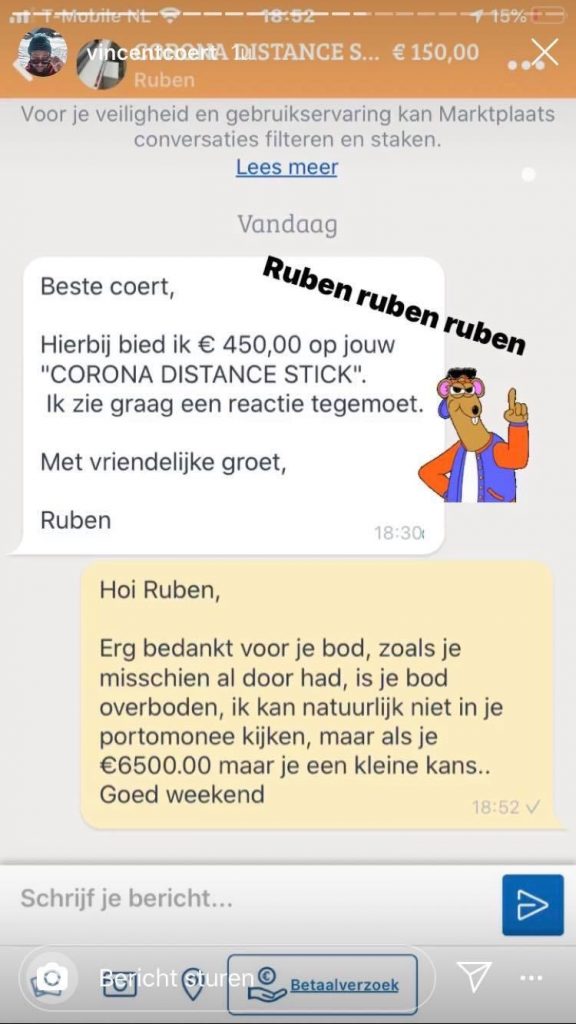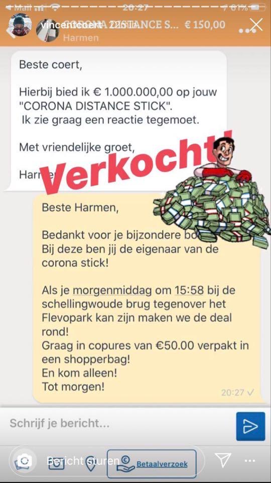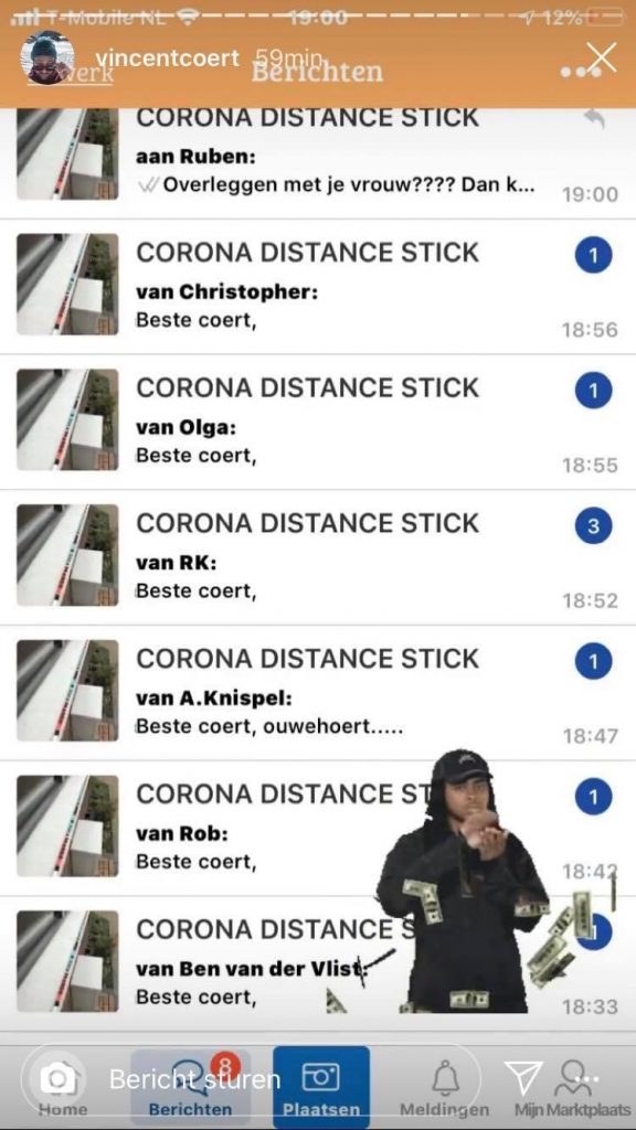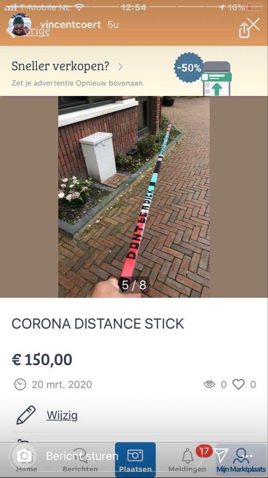 2. Er worden de laatste dagen allerlei corona-producten op Marktplaats gezet en deze stick van anderhalve meter vindt ook zijn weg daar naartoe.
