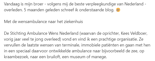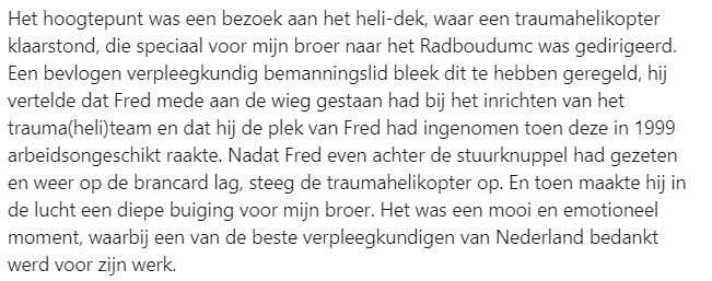 Marcellino Bogers deelt op LinkedIn een persoonlijk verhaal over zijn overleden broer. Hij was verpleegkundige en had een absolute passie voor zijn werk. Als laatste wens wou hij nog heel graag een keer terug naar zijn oude baan in het Radboundumc in Nijmegen, en gezien alle positieve reacties inspireert dit velen.