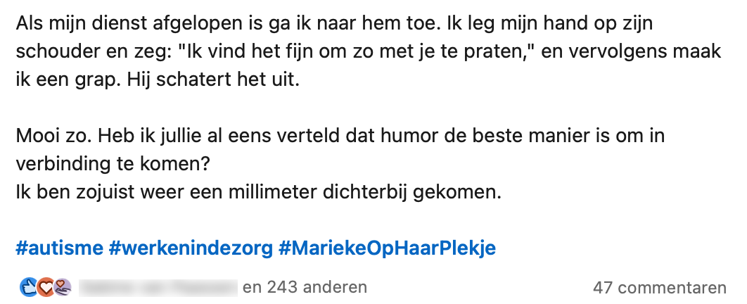 Marieke werkt in de zorg en deelt op LinkedIn dat ze nog even haar weg moet vinden met een van de nieuwe bewoners. Deze 26-jarige jongen kan haar namelijk het ene moment wegduwen en de andere keer juist wel haar aandacht willen. Hij is autistisch en weet hier zelf nog niet helemaal goed mee om te gaan. Aangezien Marieke zelf ook een dochter heeft met autisme, weet ze hoe ze hem het beste kan benaderen. Zolang ze goed met elkaar blijven praten en ook wat humor erin gooien, kunnen ze samen grote stappen maken.