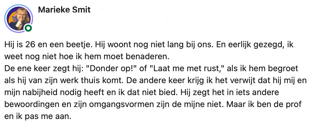 Marieke werkt in de zorg en deelt op LinkedIn dat ze nog even haar weg moet vinden met een van de nieuwe bewoners. Deze 26-jarige jongen kan haar namelijk het ene moment wegduwen en de andere keer juist wel haar aandacht willen. Hij is autistisch en weet hier zelf nog niet helemaal goed mee om te gaan. Aangezien Marieke zelf ook een dochter heeft met autisme, weet ze hoe ze hem het beste kan benaderen. Zolang ze goed met elkaar blijven praten en ook wat humor erin gooien, kunnen ze samen grote stappen maken.
