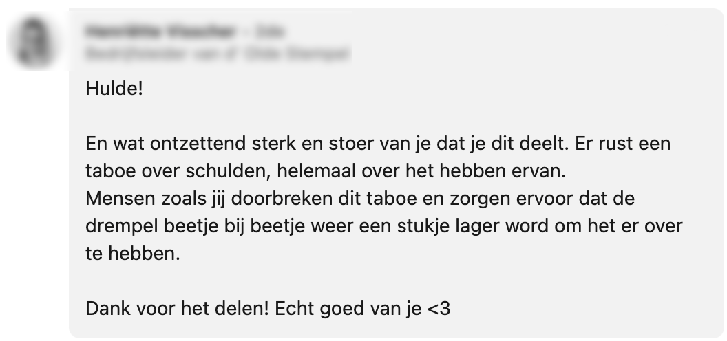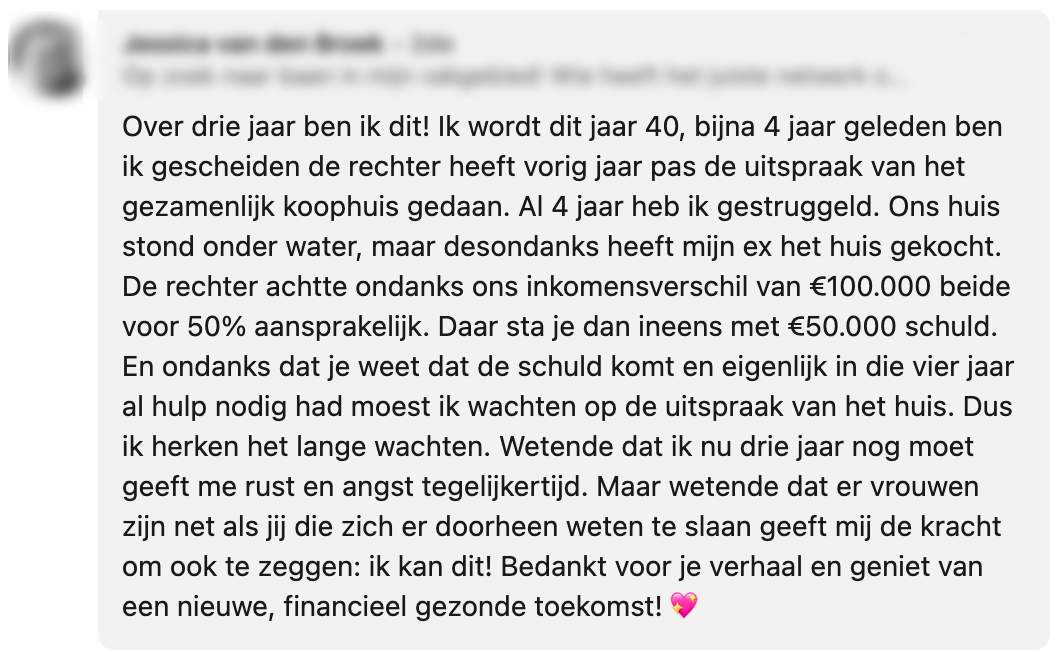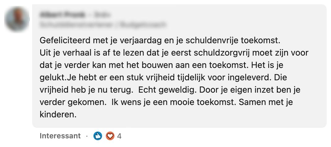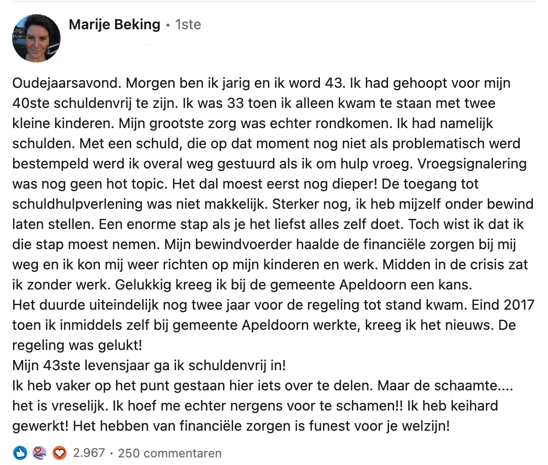 Als alleenstaande moeder van twee kinderen had Marije schulden. Jarenlang heeft ze keihard gewerkt om hier van af te komen en na een lange strijd kan er eindelijk feestgevierd worden: ze is schuldenvrij! Marije deelt dit heugelijke nieuws op Linkedin en al snel kan ze op fijne reacties rekenen.