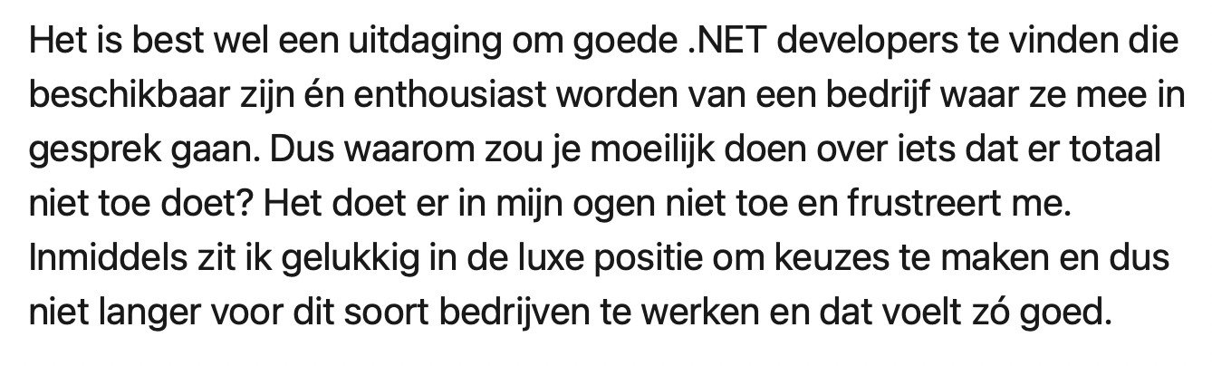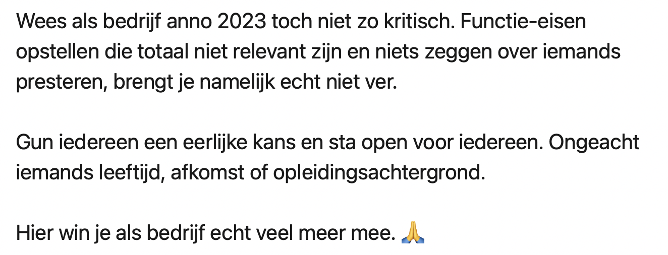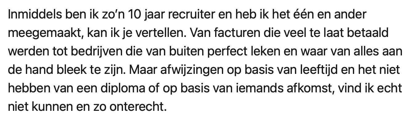 Solliciteren kan een hoop energie kosten. Al helemaal als je te maken krijgt met afwijzing na afwijzing. De ene keer ben je op je achttiende te oud en de andere keer heb je te weinig ervaring. Het liefst vinden ze iemand van zes jaar oud (lekker goedkoop) met vierendertig jaar ervaring die vloeiend Mandarijn spreekt en de maandlanding op z’n cv heeft staan. Ook Marije loopt als recruiter tegen dit probleem aan en ziet sollicitanten gediscrimineerd worden. Ze deelt haar bizarre verhaal op LinkedIn.