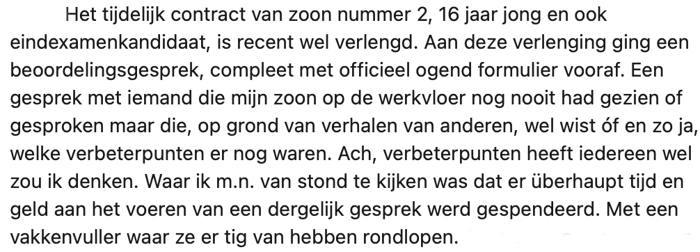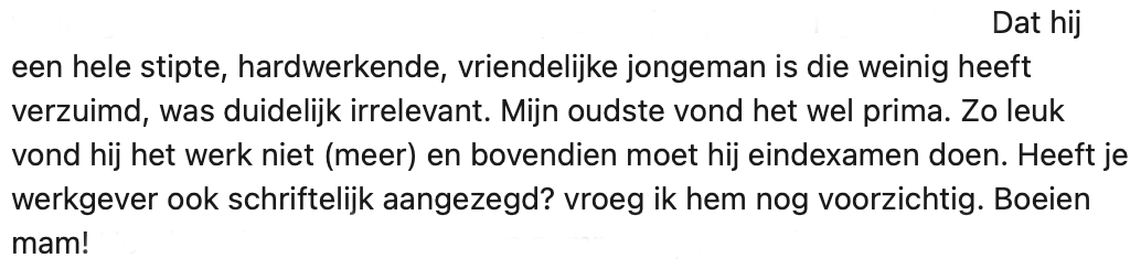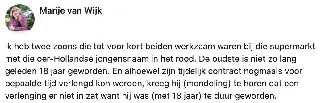 1. Marije vertelt dat haar zoon van 18 mondeling werd ontslagen omdat hij ’te oud’ en dus te duur was geworden.