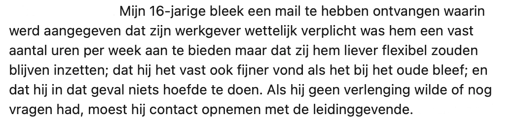 Marije is arbeidsrechtjurist en heeft twee zoons die als vakkenvullers in een supermarkt hebben gewerkt. We weten allemaal dat je als arbeidskracht onder de achttien enorm ‘aantrekkelijk’ bent voor supermarktketens, maar dat je contract sneller dan het licht wordt opgezegd als je die grens bent gepasseerd. Zo ook bij één van de zoons van Marije. Haar andere zoon kreeg een opmerkelijke mail over dat hij ‘vast wel een 0-uren contract zou willen in plaats van een vast aantal uren’. Gelukkig hebben beide heren hun moeder om af en toe mee te kijken, maar eigenlijk zouden alle jongeren de beginselen van contracten en arbeidsrecht moeten weten.