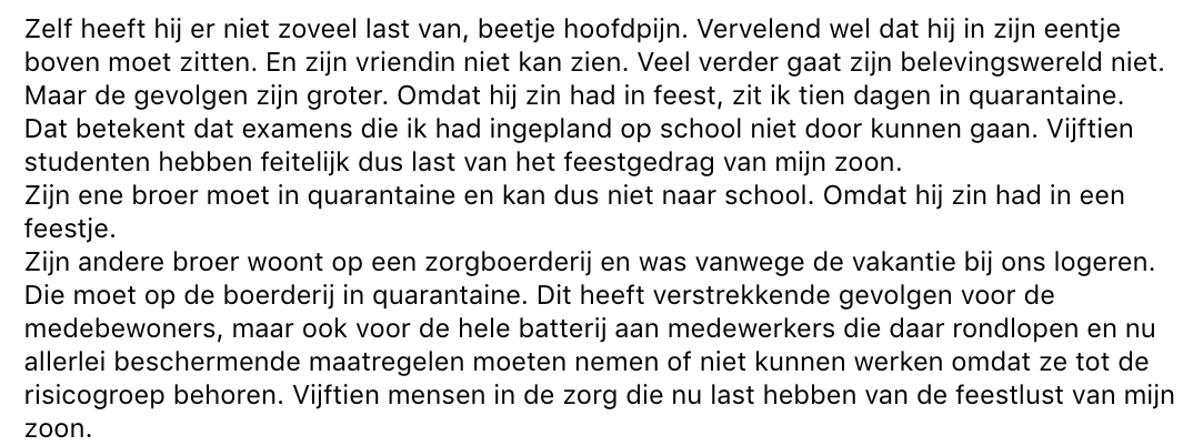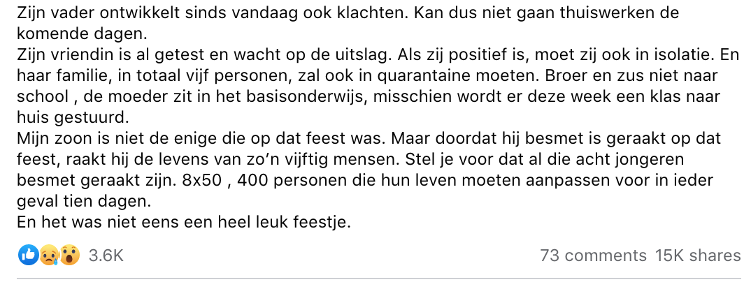 4. Om nog even voorop te stellen: dit is geen verhaal van zondebokken. Het is een verhaal dat laat zien dat zelfs met bewuste en goede intenties, het alsnog mis kan gaan op een manier dat het meer mensen raakt dan je van tevoren kunt verzinnen. We gaan allemaal meer van elkaar houden na een paar drankjes, maar we kunnen beter van elkaar houden door even te dimmen met gezellige groepsvorming. Om daarna alleen maar positief te worden getest op een kater.