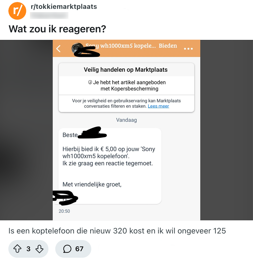 Als je iets via Marktplaats probeert te verkopen, loop je geheid tegen een aantal problemen aan. Zo weet je niet precies in welke categorie je oeroude kledingkast thuishoort, of komt een koper voor de zoveelste keer niet opdagen. Daarnaast krijg je gegarandeerd te maken met gierige Nederlanders die zo laag mogelijk bieden. Deze Reddit-gebruiker ontvangt een belachelijk bod op een koptelefoon, en staat effe met de mond vol tanden. Gelukkig weten andere Nederlanders precies hoe je zo’n bieder met gepaste precisie de mond snoert.