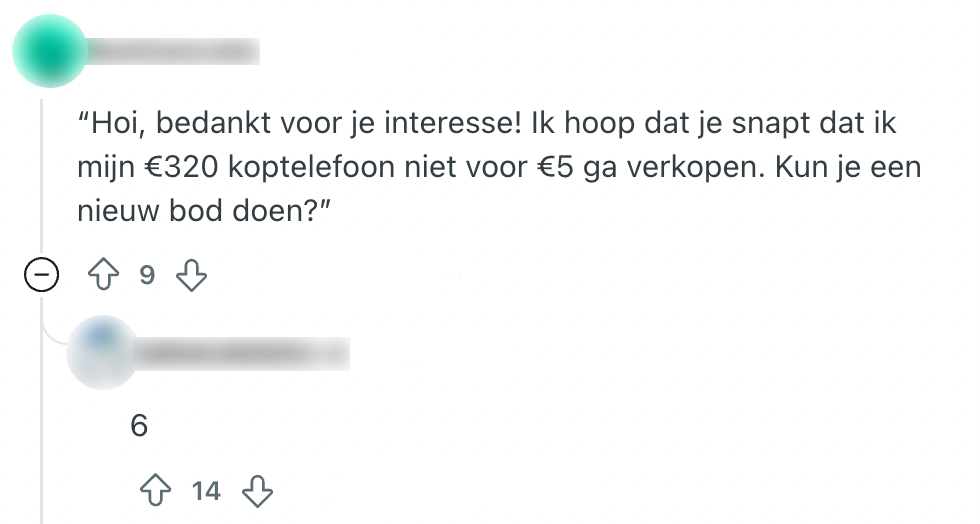 Als je iets via Marktplaats probeert te verkopen, loop je geheid tegen een aantal problemen aan. Zo weet je niet precies in welke categorie je oeroude kledingkast thuishoort, of komt een koper voor de zoveelste keer niet opdagen. Daarnaast krijg je gegarandeerd te maken met gierige Nederlanders die zo laag mogelijk bieden. Deze Reddit-gebruiker ontvangt een belachelijk bod op een koptelefoon, en staat effe met de mond vol tanden. Gelukkig weten andere Nederlanders precies hoe je zo’n bieder met gepaste precisie de mond snoert.