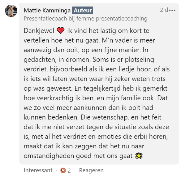 Op LinkedIn schreef Mattie een bijzonder bericht. Haar vader is onlangs overleden, iets wat een enorme impact op haar heeft gemaakt. Ze vertelt dat veel mensen haar wilden helpen, maar soms niet wisten hoe. Zo zet ze tien ervaringen op een rijtje, die haar in de moeilijke tijd enorm hebben geholpen. Mattie hoopt op deze manier andere mensen te inspireren hoe je goed voor je naasten kan zorgen wanneer iemand rouwt. Veel mensen leven met haar mee, en zijn Mattie dankbaar voor haar verhaal.