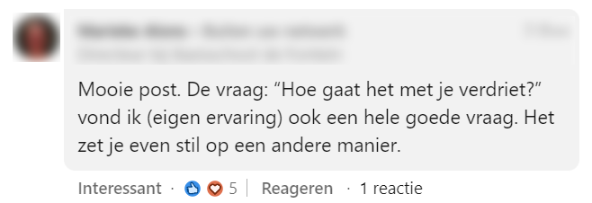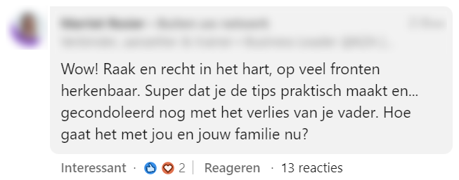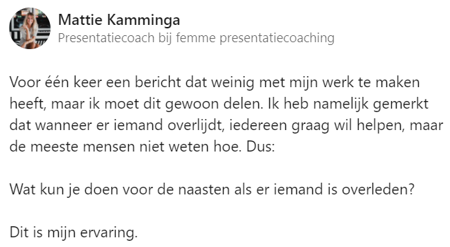 Op LinkedIn schreef Mattie een bijzonder bericht. Haar vader is onlangs overleden, iets wat een enorme impact op haar heeft gemaakt. Ze vertelt dat veel mensen haar wilden helpen, maar soms niet wisten hoe. Zo zet ze tien ervaringen op een rijtje, die haar in de moeilijke tijd enorm hebben geholpen. Mattie hoopt op deze manier andere mensen te inspireren hoe je goed voor je naasten kan zorgen wanneer iemand rouwt. Veel mensen leven met haar mee, en zijn Mattie dankbaar voor haar verhaal.