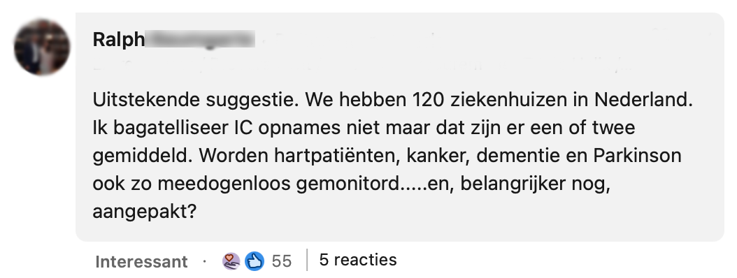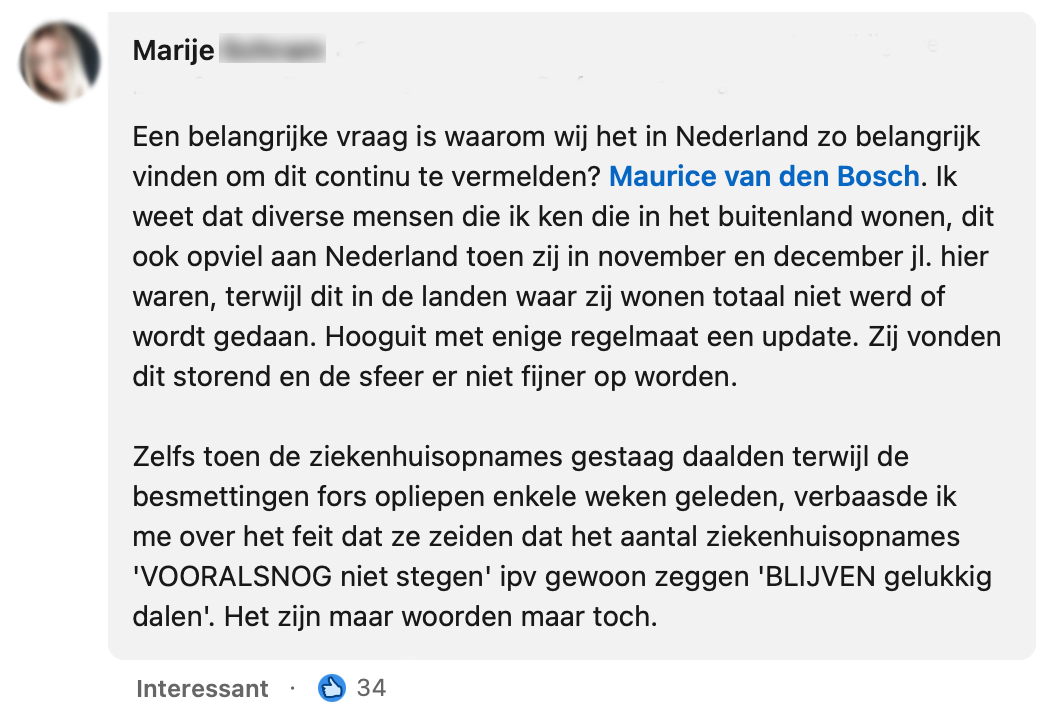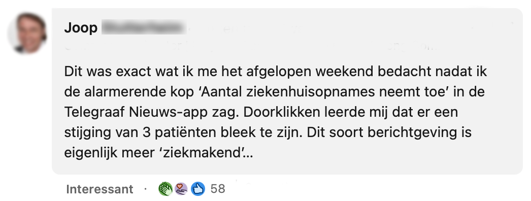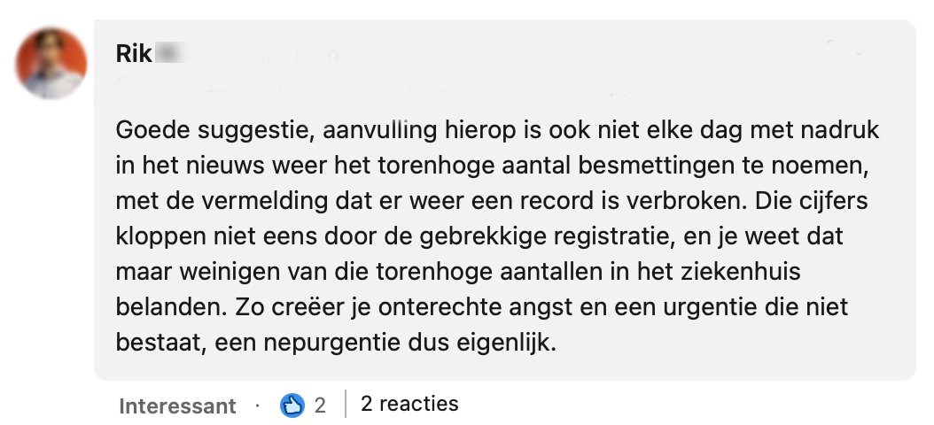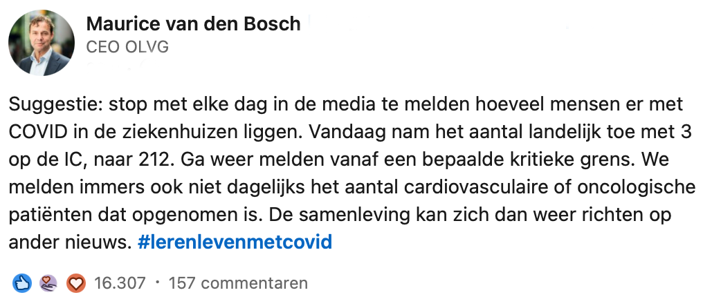 Maurice van den Bosch is CEO bij het OLVG, een ziekenhuis in Amsterdam. Op LinkedIn en Twitter deelt hij een suggestie waarbij hij voorstelt om te stoppen met het delen van de ziekenhuisopnamen door corona in de media. Dit zodat mensen zich weer kunnen richten op ander nieuws. Een aantal zijn het met hem eens, maar anderen vinden ook dat het monitoren en delen van het aantal besmettingen en opnamen juist goed is. Onder het bericht van Maurice gaan mensen met elkaar in discussie.