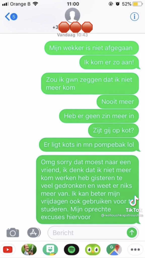 Hoe langer je ergens werkzaam bent, hoe vertrouwder je vaak raakt met je leidinggevende bijvoorbeeld. Maar, we denken nooit vertrouwd genoeg om je baas een berichtje te sturen dat je door je wekker heen bent geslapen, om vervolgens de échte reden dat je niet komt opdagen, óók naar je baas te sturen. En al helemaal niet als je er pas één dag werkzaam bent. Of een berichtje met excuses daarna nog werkt, dat hangt dan weer af van de baas. Maar bij dit meisje liep het niet goed af.