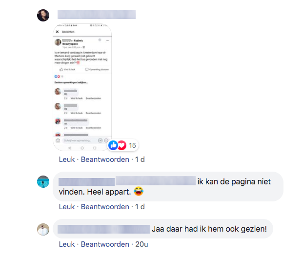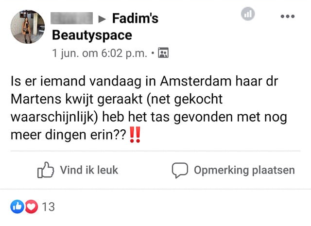 1. Afgelopen dinsdag deelde Tess dit bericht. Een noodoproep. Hoewel ze zelf ook erkent dat het niet haar helderste moment was, is het natuurlijk super balen om je nieuwe schoenen dezelfde dag nog kwijt te raken. Ze deelde hetzelfde bericht ook in de Facebook-groep Amsterdam Durft te Vragen.