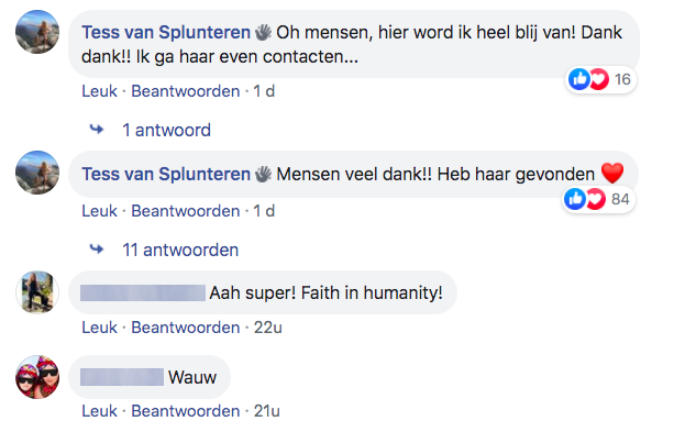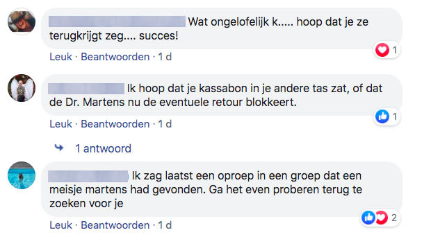 6. Niet veel later komt Tess met de woorden die de hele Facebook-groep wilde horen: er is contact met de persoon die de Dr. Martens gevonden heeft.