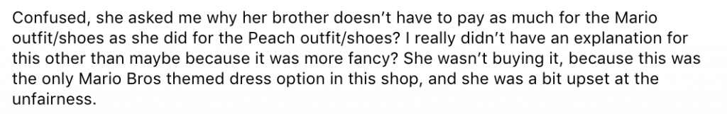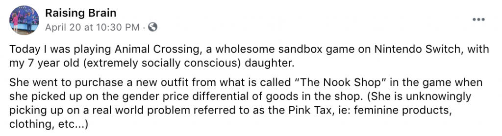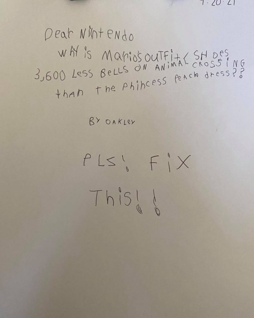 Er worden tegenwoordig nog steeds veel producten gehangen aan een bepaald gender. Roze voor meiden, blauw voor jongens. En vaak zijn de producten gericht op vrouwen ook nog duurder, terwijl er in de kwaliteit weinig verschilt. Dit viel ook een zevenjarig meisje op die de game Animal Crossing aan het spelen was op haar Nintendo Switch. Toen zij een nieuwe outfit wilde kopen in het spel, viel het haar op dat die van haar broertje een stuk goedkoper was. Toen haar moeder geen antwoord kon geven op de vraag waarom dat zo was, besloot ze een brief te sturen naar Nintendo.