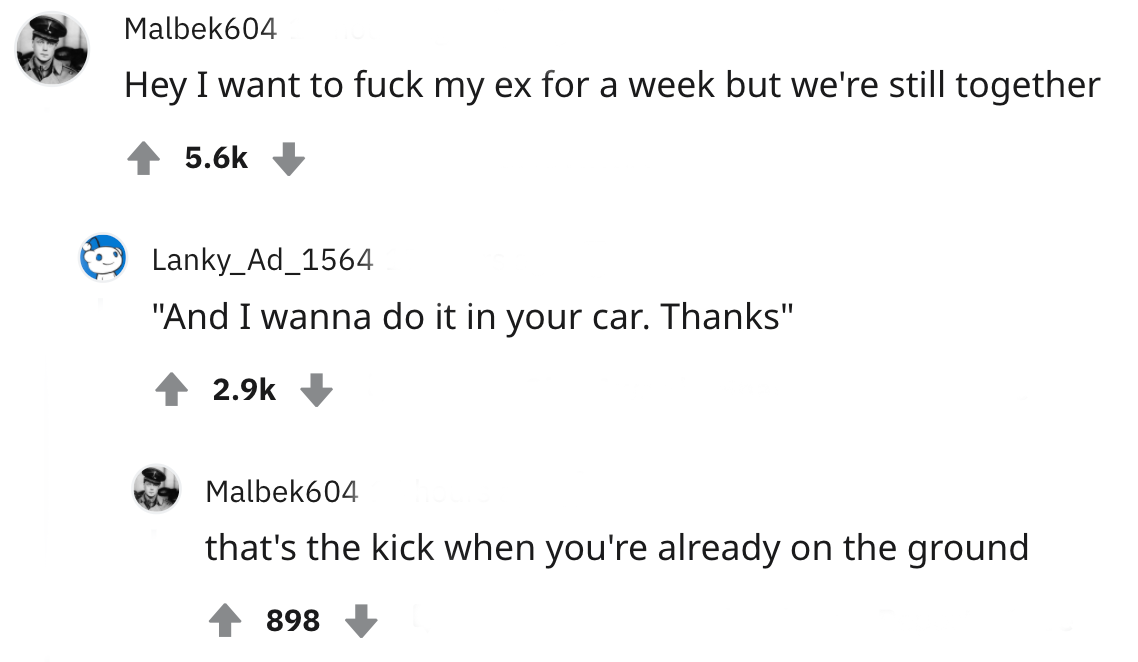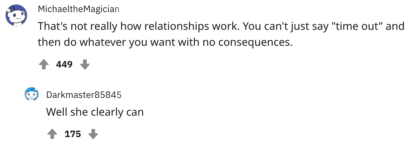 Wat doe je als het niet helemaal lekker gaat in je relatie? Je kan het natuurlijk uitmaken, maar een middenweg is om een korte break te nemen. De vriendin van deze redditor gebruikt echter een break op een wel heel bijzondere manier. Ze wil hem namelijk kort verlaten, ondanks dat alles goed gaat, zodat ze met een ander om kan gaan…