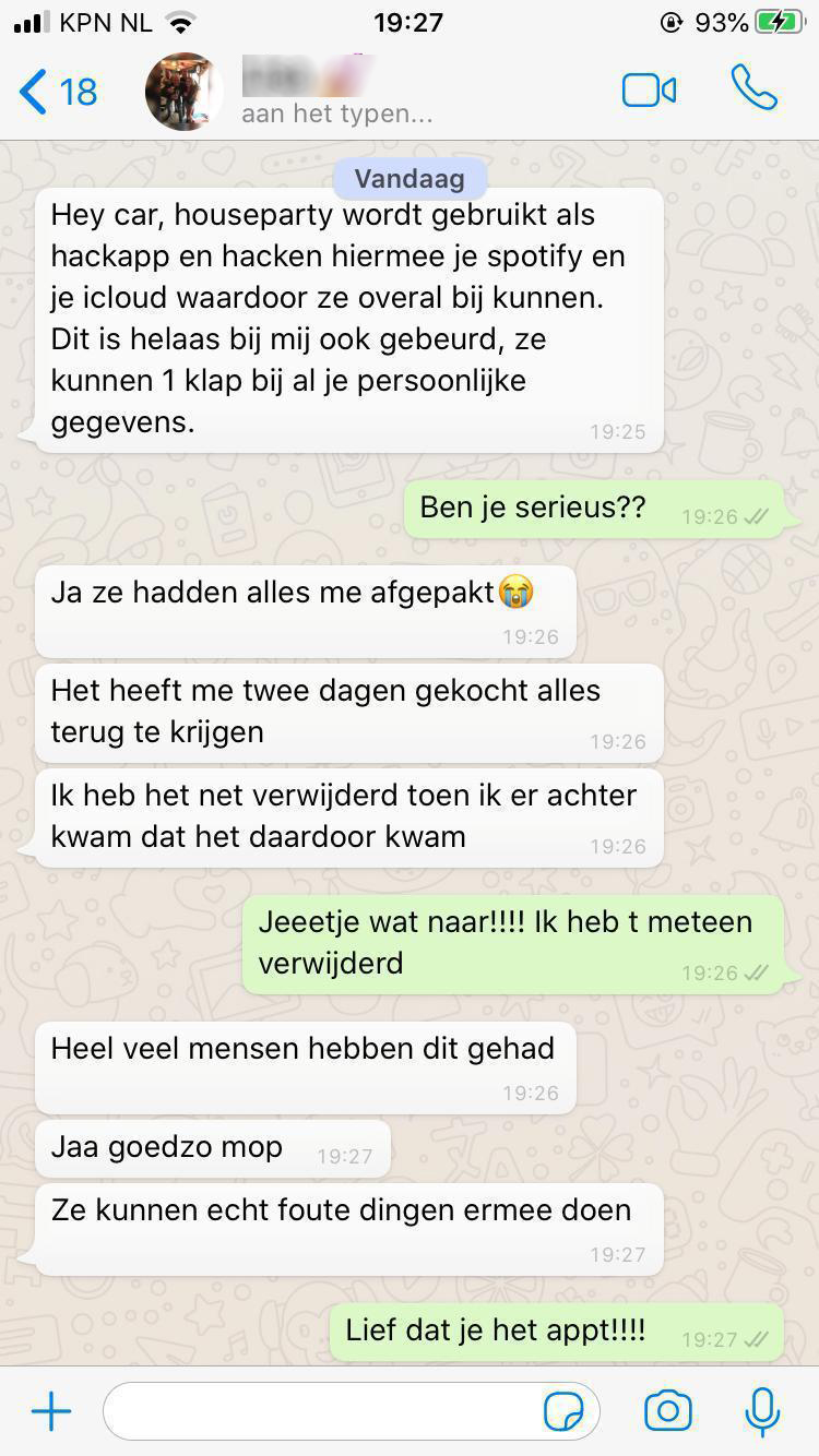 Eigenlijk moet je er altijd voor zorgen dat je voor elke app een ander wachtwoord gebruikt. Doe je dat niet, en er is een datalek bij een of andere vage webshop waar je je ooit voor hebt aangemeld, dan kunnen hackers natuurlijk ineens in al je accounts. En omdat ongeveer de hele wereld de afgelopen weken Houseparty gedownload heeft, zouden ze nu de schuld kunnen krijgen van alle hacks en datalekken omdat iedereen denkt: ‘Dat is gehackt ben, moet wel door die app komen’ terwijl daar geen direct bewijs voor is.