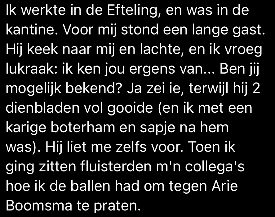Gisteren schreven we een verhaal over Patrick, die perplex stond nadat hij bij Arjen Robben een maaltijd moest bezorgen. Naar aanleiding hiervan kwamen jullie met de meest veelzijdige nationale én internationale sterren die jullie ‘in het wild’ hebben gespot. Het was een ware stortvloed aan beroemdheden, maar we hebben een selectie gemaakt van jullie meest gave, bijzondere of speciale ontmoetingen.