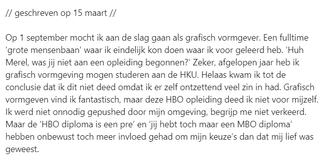 Anno 2022 word je vaak met een MBO-diploma nog steeds onderschat of als minderwaardig gezien in de maatschappij. Een compleet verkeerd beeld, waar te weinig aandacht voor is. Merel Piet deelde haar ervaring met dit probleem en sloot af met een mooie boodschap.
