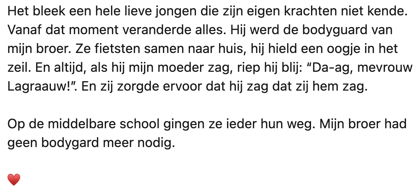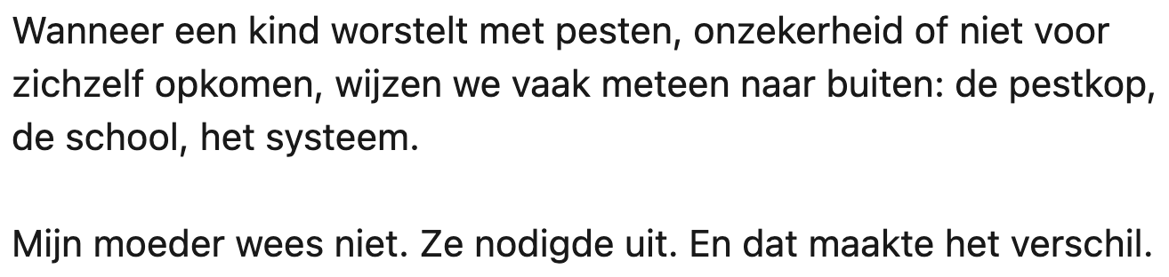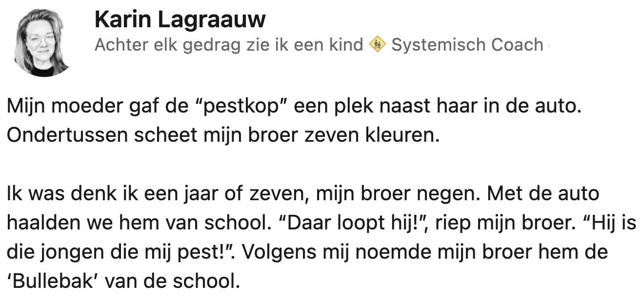 Jaren geleden werd een jongen op de basisschool gepest door een klasgenoot. Toen zijn moeder en zusje hem op een dag kwamen ophalen met de auto, zag de jongen de persoon die hem plaagde, en wees hij hem aan. De moeder twijfelde geen moment en vroeg of ze de jongen naar huis kon brengen. Daar ging hij op in, en dat autoritje zette de hele situatie op z’n kop..