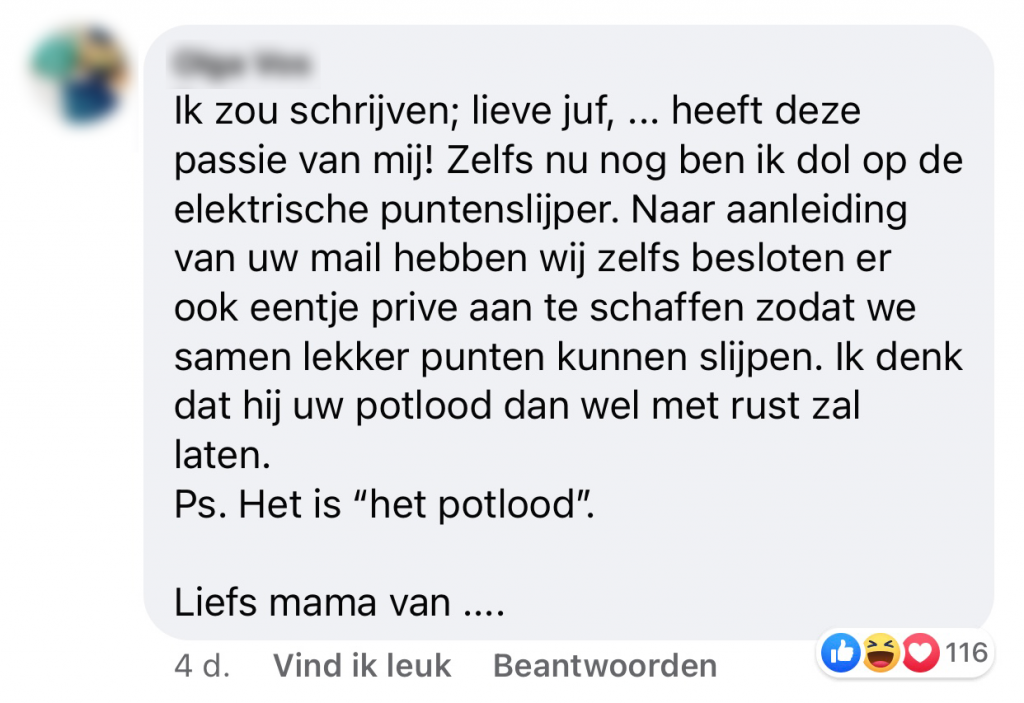 We zijn allemaal als kind wel eens ondeugend geweest. Belletje lellen bij de buren, of met stiften je creativiteit loslaten op het behang in plaats van op een vel papier. Ook deze moeder kreeg een mailtje van school dat haar kind iets had gedaan, wat toch niet helemaal de bedoeling was. Hij had namelijk wel erg enthousiast gebruik gemaakt van de automatische puntenslijper. Enigszins verbaasd door de mail vraagt de moeder Facebook om advies voor hoe ze moet reageren op de juf. En ze wordt overladen met verontwaardigde reacties.
