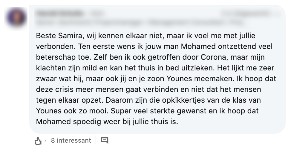 De echtgenoot van Samira ligt op de Intensive Care, vanwege corona. Dat is natuurlijk niet niks. Om hem een hart onder de riem te steken, wordt er door de hele klas van hun zoontje iets moois voor hem gedaan. Samira deelt het op social media en haar bericht gaat viral.