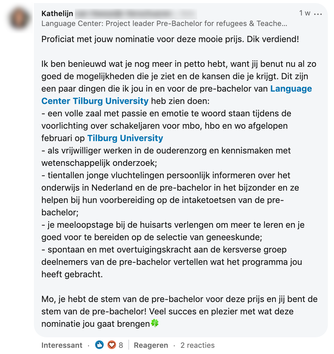 3. Hij krijgt mooie complimenten onder zijn post, van onder andere zijn docenten.