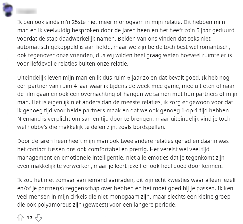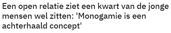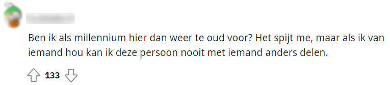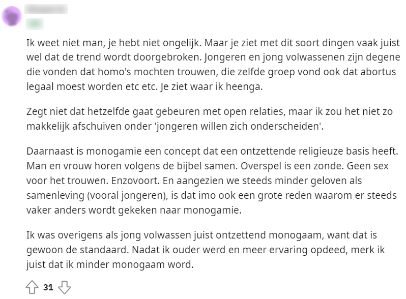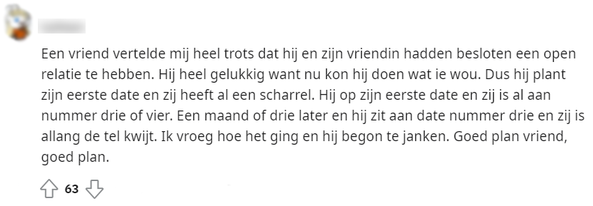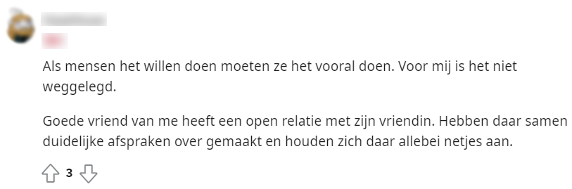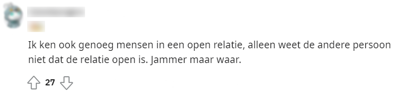Uit onderzoek van 3vraagt is gebleken dat een kwart van jongeren tussen 16 en 24 jaar zegt open te staan voor een open relatie. Dit nieuwsbericht werd gedeeld op Reddit, waarna hieronder een discussie ontstond.