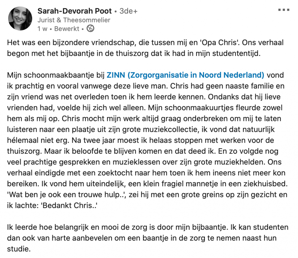 De meeste studenten zoeken een bijbaantje in de horeca of solliciteren bij de supermarkt. Sarah-Devorah niet; zij was schoonmaakster in de thuiszorg. De band die ze creëerde met ‘opa’ Chris was zó speciaal, dat ze haar verhaal op LinkedIn deelt. Ze hoopt hiermee andere studenten te inspireren om ook een (bij)baan in de zorg te nemen.