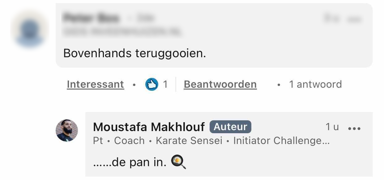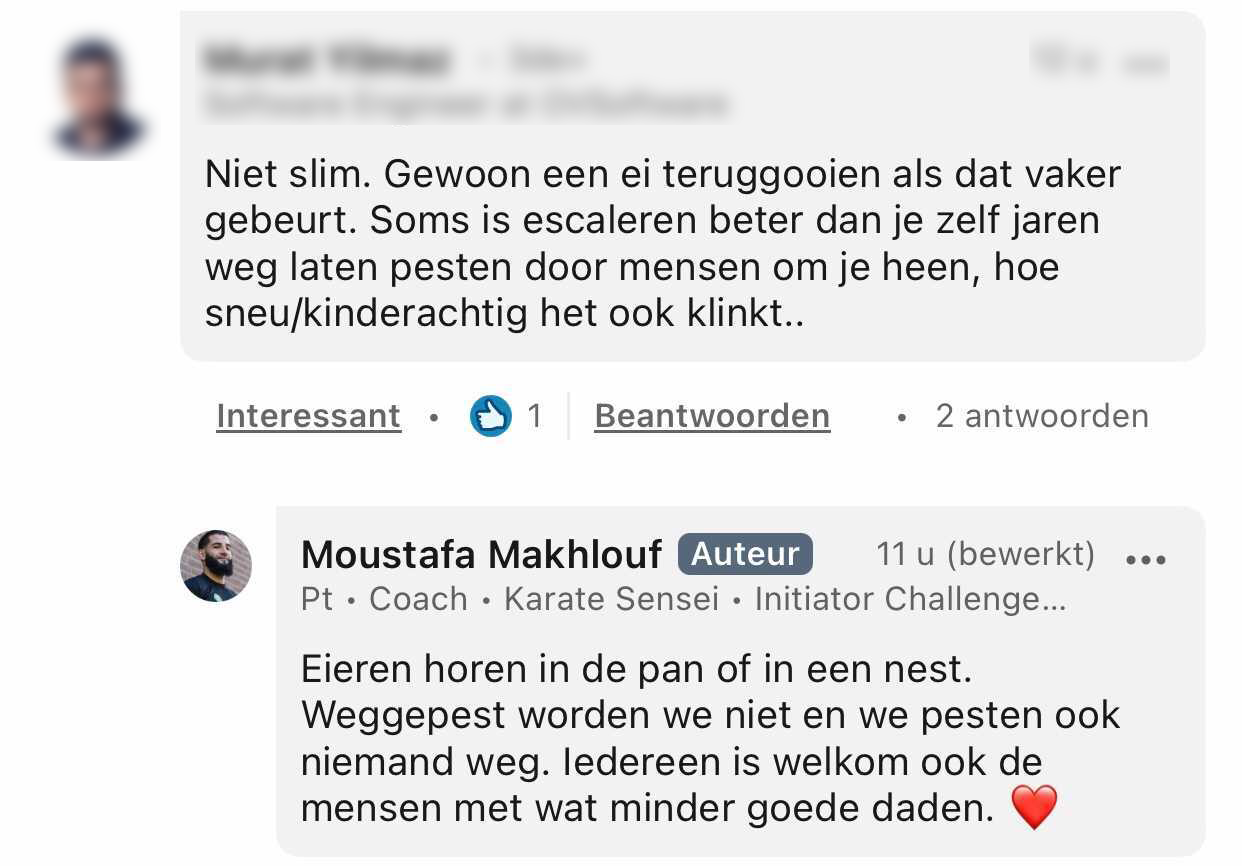 1. Moustafa plaatste beeld van de actie van de eiergooier en deze tekst erbij op LinkedIn.