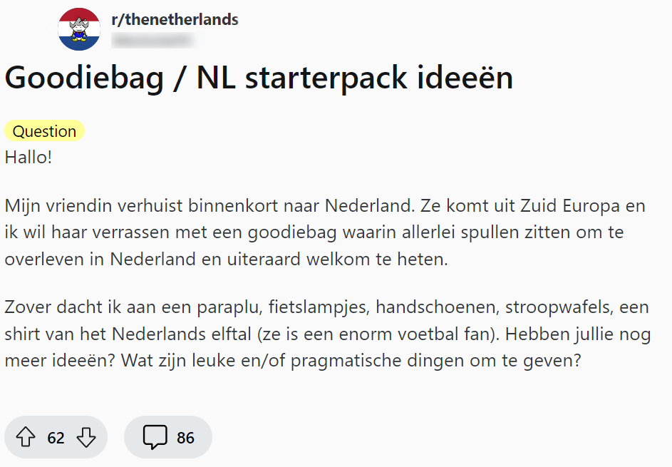 Dat liefde geen grenzen kent, nemen sommige Nederlanders maar al te graag letterlijk. De volgende Nederlander heeft, na heel wat omkoperij, zijn partner uit het zuiden van Europa zover gekregen om naar Nederland te verhuizen. Hij wil haar daarom een warm welkom in ons kikkerlandje geven, en schakelt daardoor de hulp van Reddit in om een typisch Nederlandse survivalkit samen te stellen. Eén ding is zeker: dat pakket stelt niet teleur.
