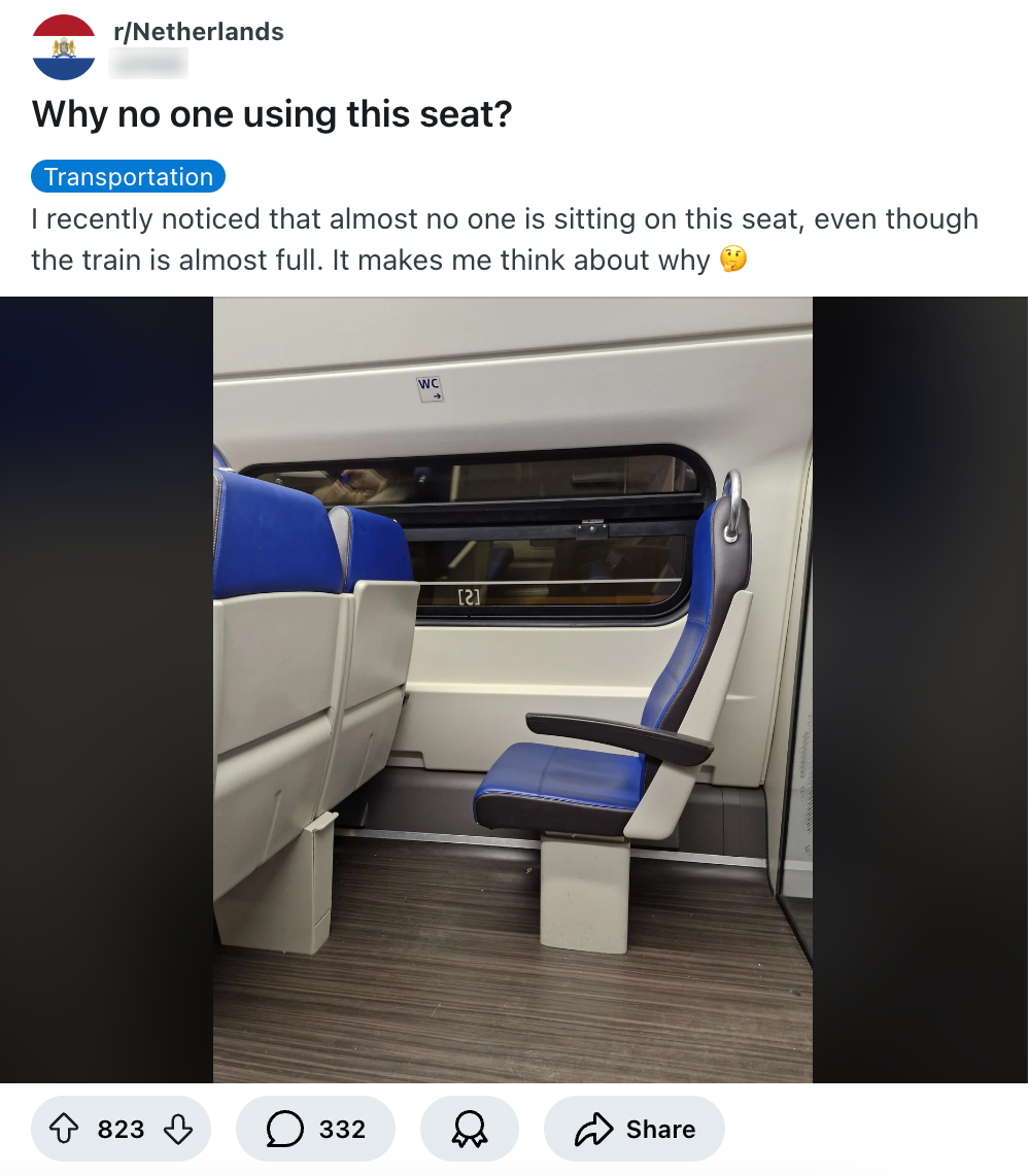 1. Deze Reddit-gebruiker vraagt zich af waarom niemand op deze stoel gaat zitten.