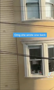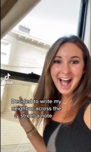 1. Dit is Natalie. Natalie is blij. Ze werkt namelijk al heel lang vanuit huis, en heeft pas ontdekt dat ze een overbuurvrouw heeft die dat ook doet. Ze besluit haar een bericht te sturen, van achter haar raam.