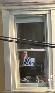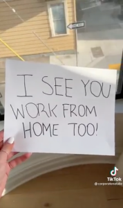 1. Dit is Natalie. Natalie is blij. Ze werkt namelijk al heel lang vanuit huis, en heeft pas ontdekt dat ze een overbuurvrouw heeft die dat ook doet. Ze besluit haar een bericht te sturen, van achter haar raam.